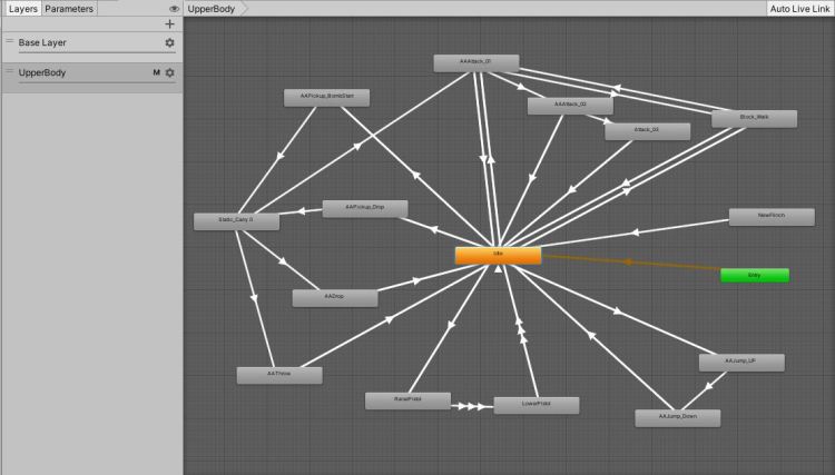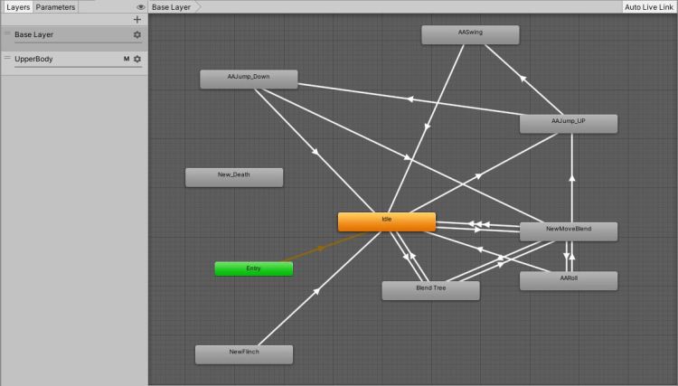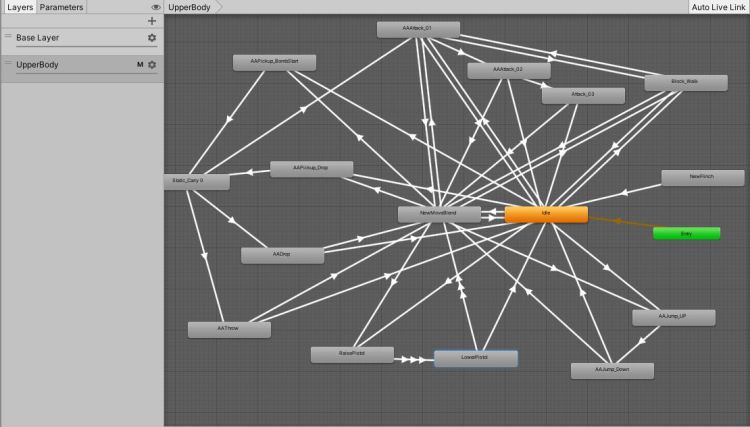 Overall, it works well but it was definitely a learning experience. On the UpperBody layer I have a separate idle animation and movement blendtree which causes it to look like a mess in the animator window, as you can see in the second picture.