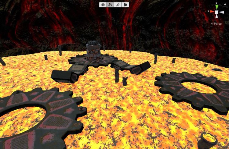 The layout of the level is straightforward. Three platforms, each with a place for the boss to appear in the middle. Each pair of platforms has a rotating platform that can rise from the lava and will always rotate in toward the boss’s platform to act as funnels.