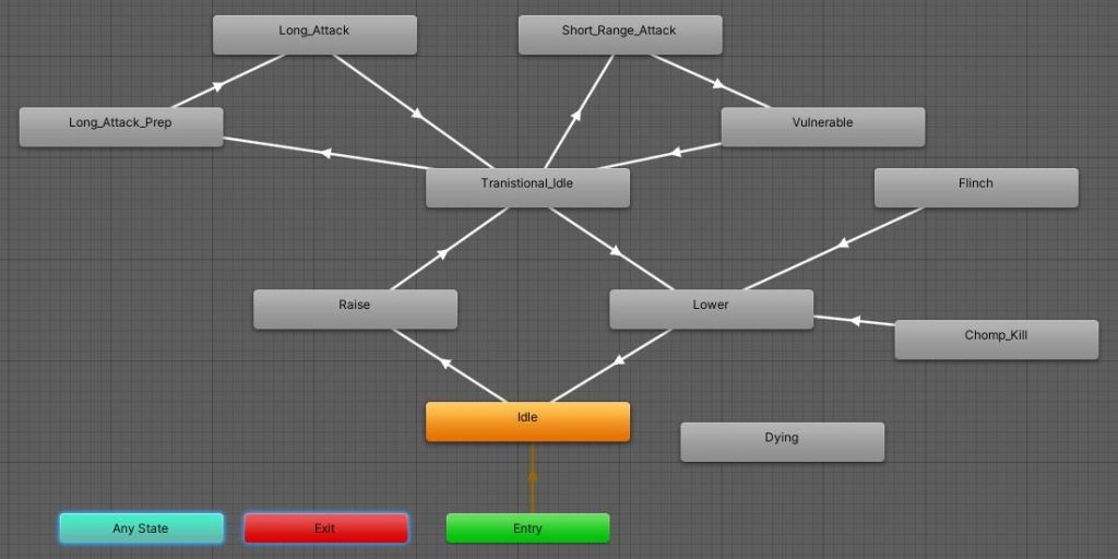 The implementation of the boss is different from the other enemies, rather than being driven by the simple enemy state machine I’d created in C#, The Great Mighty Lava relies on its animation states and animation events to drive most of its behavior.