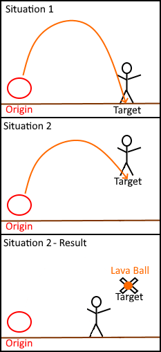 However, if the player is jumping like in Situation 2, the target position is in the air and you get some weird behavior with the lava ball getting stuck hovering in midair indefinitely!