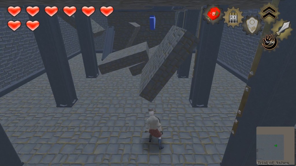 This second area in Trial of ash ended up becoming split into the second and third rooms. At first, I wanted the area to have a Bomberman feel to it, so I placed a large maze of boulders with pickups hidden throughout.