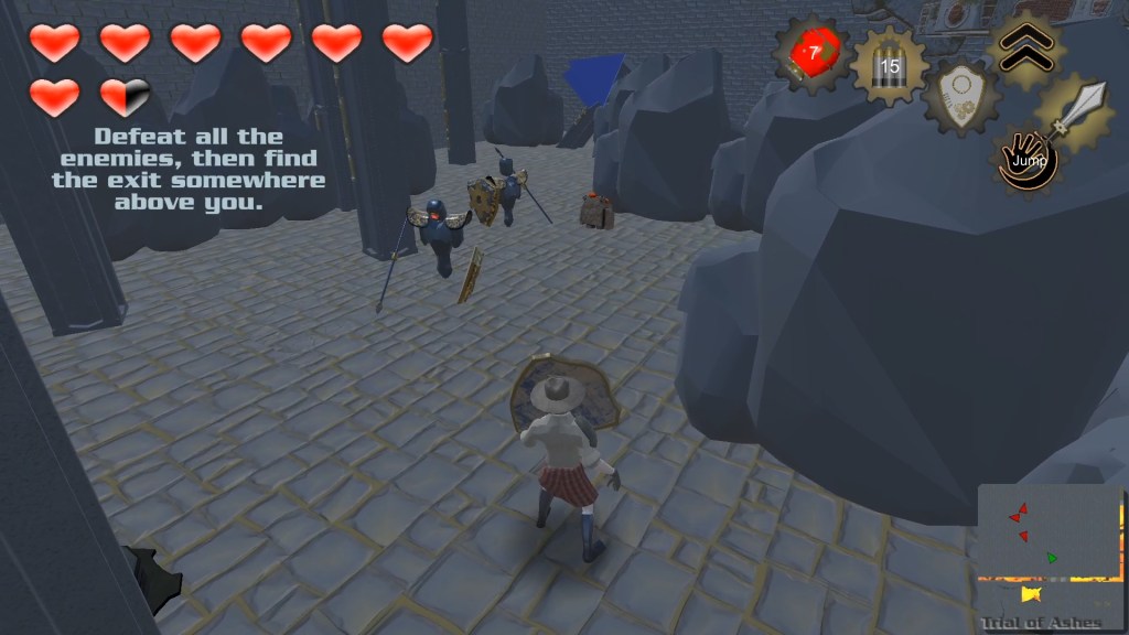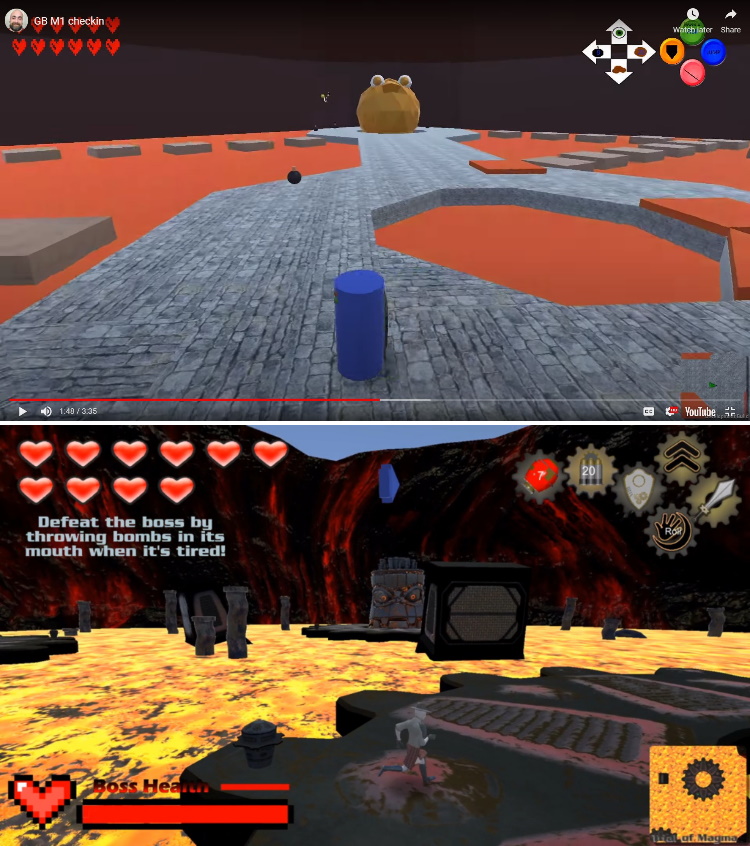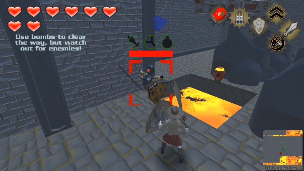 The levels in Trial of Passage are intended as proof of fun as much as anything else. Taking inspiration from The Legend of Zelda, we decided that each of us would create one or more levels focusing on one particular aspect of the game, mine was the bomb. Not a very subtle problem solving mechanic, but I thought it lent itself well to a sort of volcano theme and I knew I could have a lot of fun with that. The inclusion of lava in the levels would also give me a great opportunity to test the player’s platforming abilities.