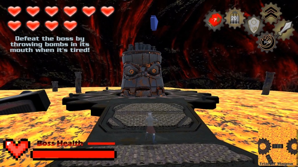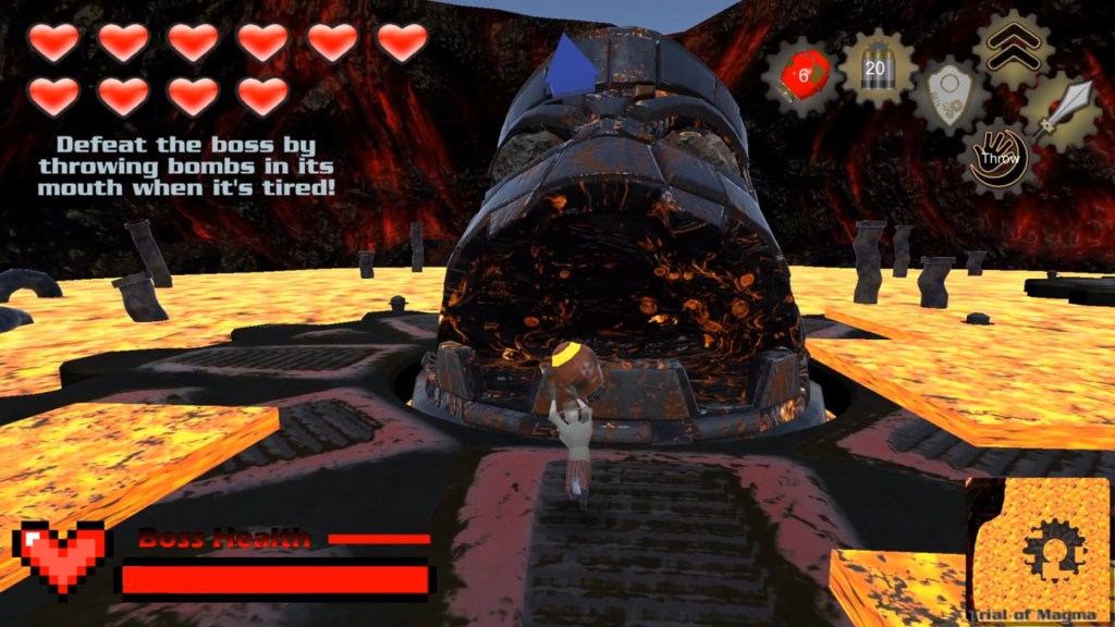 After a few volleys of attacks the boss will open its mouth, presenting the player with an opportunity to damage it by throwing a bomb into it’s mouth.