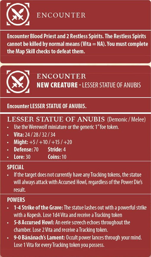 When the final encounter begins, all characters with tracking tokens have to pass a Faith check: those who succeed discard their tracking tokens and take their turn, however those who fail discard a single tracking token and lose their turn. Enemies will not target any character still in possession of a tracking token, but they’ll have to repeat the Faith check each turn until they either pass or have discarded all of their tracking tokens to join the battle.