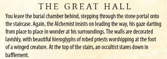 In my second story, the characters travel across Kremel to a forgotten crypt with a portal that leads to a sunken pyramid in a far off land. The Affliction is a fallen angel, and the characters are tempted at every step by offered power. In most Folklore stories, Rituals are magic scrolls that characters receive only rarely. In this story they’re much more plentiful and there are additional story moments where characters can rely on the occult to benefit themselves, but characters receive a tracking token for every Ritual or Occult skill check. In my experience playtesting this story, I mostly found that receiving the tokens without knowing what they were for made players nervous… but not always nervous enough to eschew the use of Rituals entirely. Groups mostly agreed that they were probably a bad thing, but tended to split on their assumption of exactly how bad it would turn out to be.